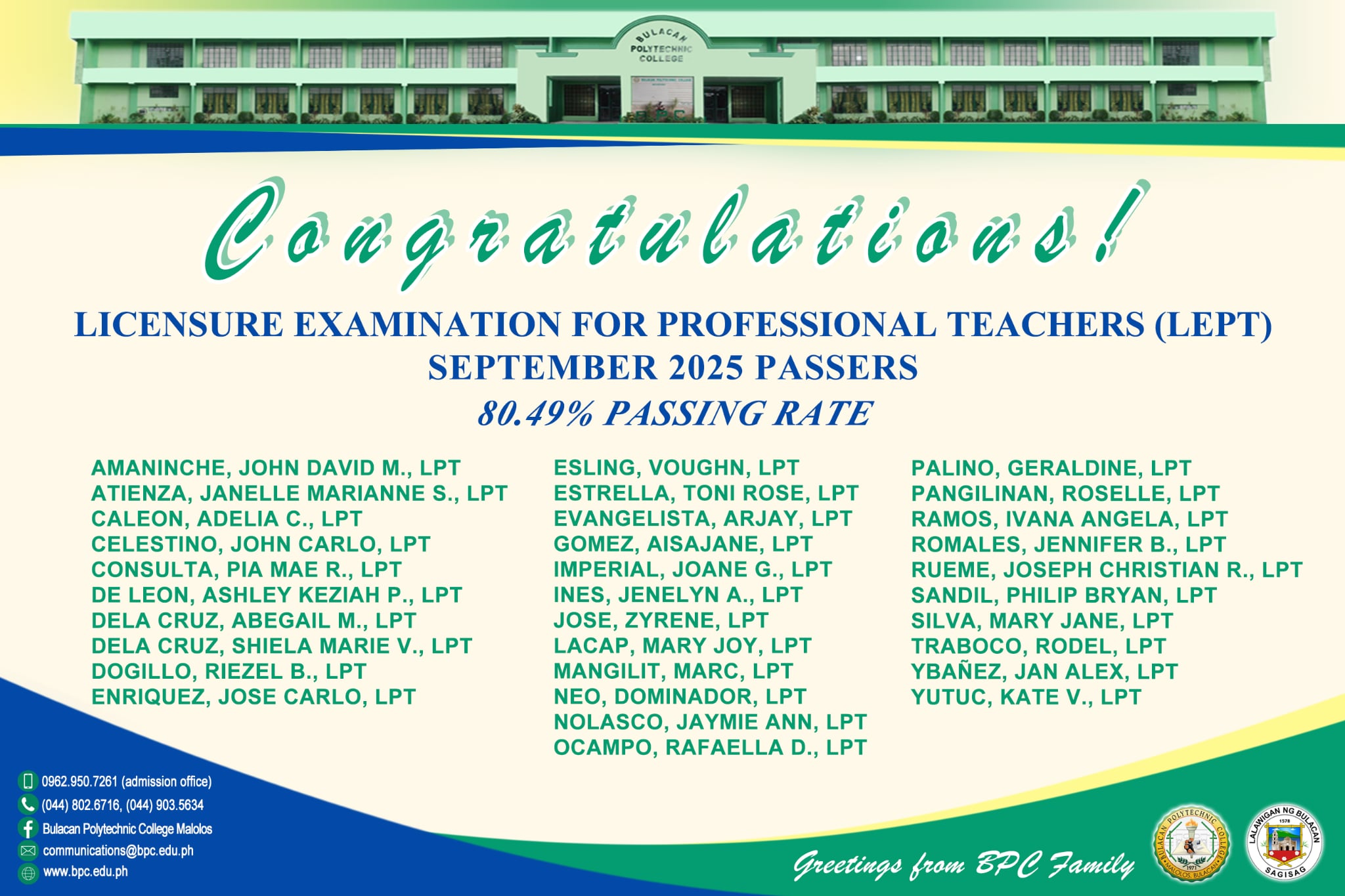 Bulacan Polytechnic College proudly extends its warmest congratulations to our graduates who successfully passed the Licensure Examination for Professional Teachers held last September 2025. Achieving an impressive 𝗼𝘃𝗲𝗿𝗮𝗹𝗹 𝗽𝗮𝘀𝘀𝗶𝗻𝗴 𝗿𝗮𝘁𝗲…
