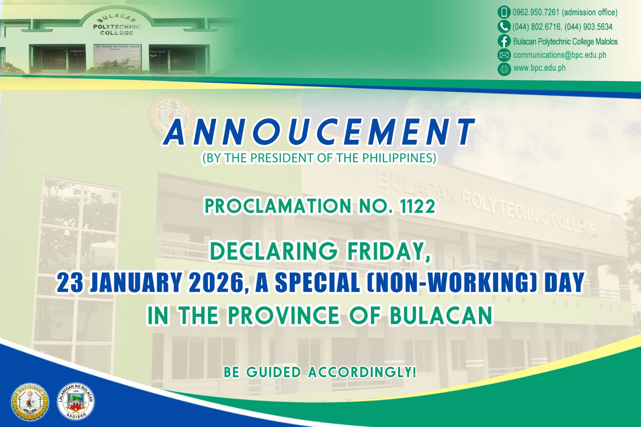 Special Non-Working Day admin January 26, 2026 No Comments Malacañang has proclaimed Friday, January 23, 2026, as a Special (Non-Working) Day across the Province of Bulacan. This is in accordance with Proclamation No. 1122, which enables the province to… Read more